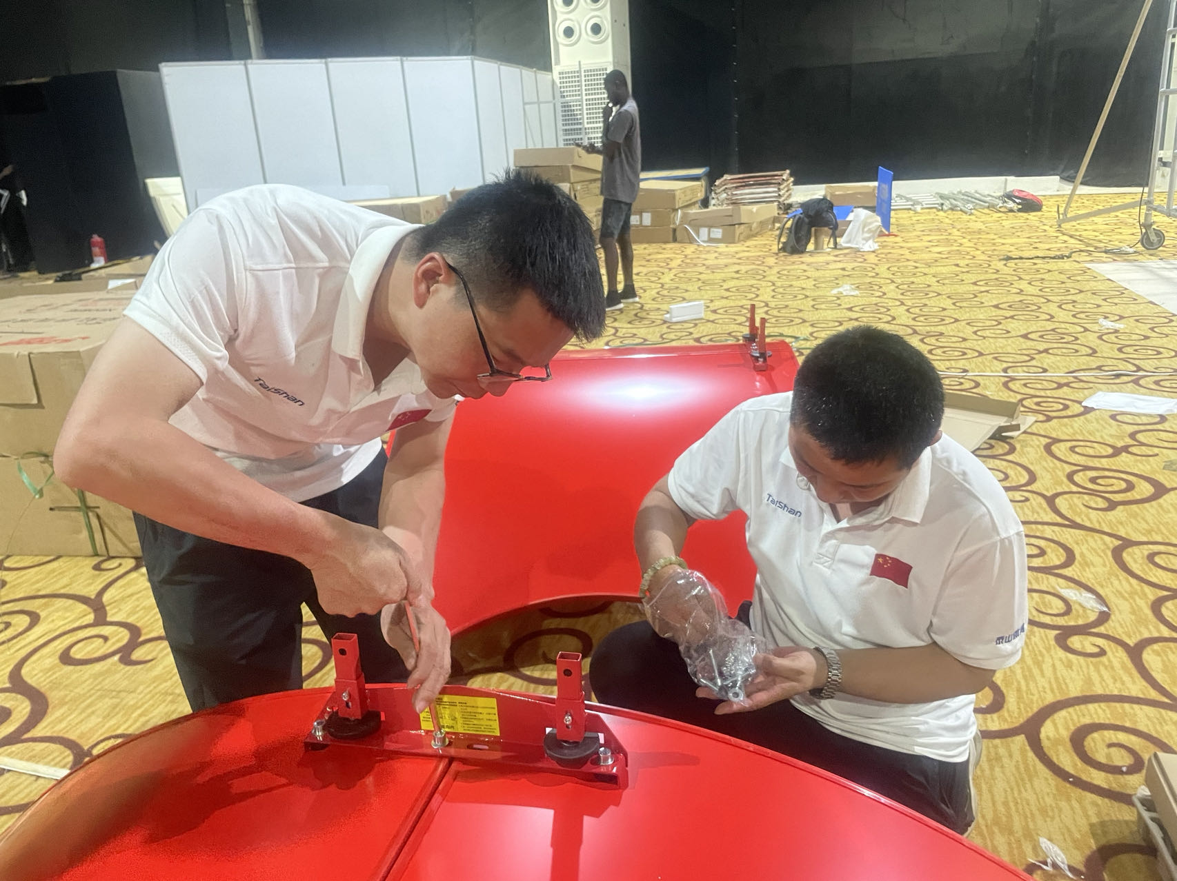 作为全球体育健康一站式解决方案服务商,好博体育体育服务保障团队是一支不可或缺的重要力量,赛事服务保障团队既包括产品设计、研发技术人员,也包括制造、生产、集成、服务人员,对每一款产品的研发、生产、性能都了如指掌,形成了从产品研发到下线的全流程闭环跟踪服务模式。目前,非运会好博体育体育器材正在紧张有序的安装中,服务保障团队发扬一丝不苟、精益求精、注重细节、环环相扣的敬业精神,在器材组装、调试工作中,不放过那怕一颗螺丝和微小部件,保障每一件器材的使用性能都达到最优状态。